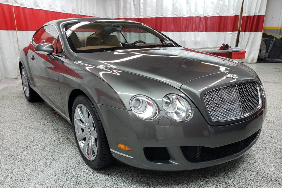 This 2009 Bentley Continental GT is powered by a twin-turbocharged 6.0-liter W12 paired with a six-speed automatic transaxle and all-wheel drive. Finished in dark silver over tan and brown leather upholstery, it features an automatic rear spoiler, xenon headlights, 19″ chrome-finish wheels, adjustable air suspension, heated and power-adjustable front seats, dual-zone automatic climate control, and a navigation system.
