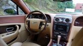 The cabin is trimmed in tan leather with matching deep-pile carpets, while darker brown leather covers the upper dashboard, door panel inserts, and rear parcel shelf. Burl walnut veneer aLents the dashboard, center console, door panels, rear console, and steering wheel, and additional amenities include heated and power-adjustable front seats, automatic climate control, cruise control, a Breitling clock, a ten-speaker sound system with an iPod interface, and factory infotainment with DVD-based navigation.