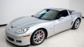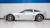 The Z06 features a hydroformed aluminum chassis paired with composite and carbon-fiber bodywork. This example is finished in Blade Silver Metallic and features fog lights, xenon headlights, vented fender panels, and quad exhaust outlets.