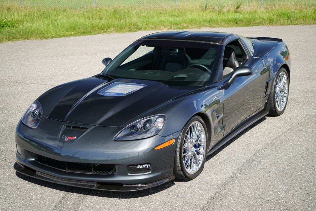 This 2009 Chevrolet Corvette ZR1 is finished in gray over two-tone gray leather upholstery and is powered by a supercharged 6.2-liter LS9 V8 paired with a six-speed manual transaxle and a limited-slip differential. Equipment includes Brembo carbon-ceramic brakes, Magnetic Selective Ride Control, staggered-diameter chrome wheels, a head-up display, cruise control, and the 3ZR Premium Equipment Group.