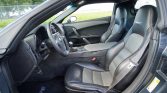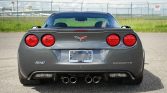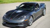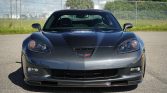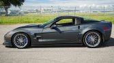 The car is finished in gray and features a carbon-fiber roof panel, front splitter, and rocker extensions. The front fenders and hood are also constructed from carbon fiber, and the hood features a polycarbonate window that displays the Corvette-branded supercharger cover. Additional exterior details include integrated front fog lights, xenon headlights with automatic lamp adjustment, and heated and power-adjustable mirrors.