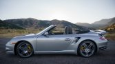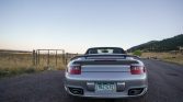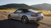 This 2009 Porsche 911 Turbo cabriolet is finished in GT Silver Metallic with a black convertible top over black leather and is powered by a twin-turbocharged 3.6L flat-six driving all four wheels through a six-speed manual transaxle. Equipment includes a body-color removable hardtop, 19” wheels, fog lights, Porsche Ceramic Composite Brakes, the Sport Chrono Package Turbo, a Bose sound system, and heated and adaptable front sport seats.