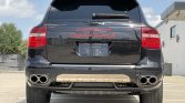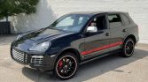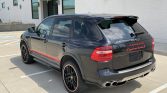 The car is finished in Basalt Black Metallic and features red badging and side stripes with Cayenne Turbo S graphics. Additional equipment includes a panoramic glass roof system, stainless steel nose and tail trim, fog lights, and a stainless steel exhaust system with quad outlets.