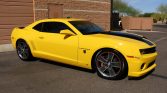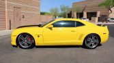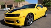 This 2010 Chevrolet Camaro SS Transformers Edition is #007 of approximately 250 examples modified by Street Legal Performance with the ZL575 package featuring a supercharged 6.2L V8 paired with a six-speed manual transmission and a limited-slip differential. The car is finished in Rally Yellow with black rally stripes over black leather upholstery and equipped with HID headlights, a Performance RTM hood, 20″ Red Line wheels, SLP sport suspension springs and adjustable sway bars, Brembo brakes, air conditioning, rear…