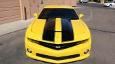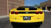 The car is finished in Rally Yellow and features black rally stripes and Autobot shields on the fenders which are unique to the Transformers Edition. Additional equipment includes HID headlights with halo rings, fog lights, an SLP grille insert, a Performance RTM hood with a fascia close-out panel, a rear spoiler, dual exhaust outlets, window tint, and ZL575 badging.