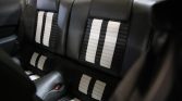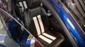 The cabin features seats upholstered in Charcoal Black leather with white center stripes and embossed backrests. The driver’s seat is power-adjustable, and other equipment includes dual-zone automatic climate control, cruise control, and a Sync infotainment system with a CD player, satellite radio connectivity, and Shaker audio.