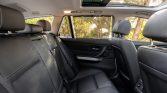 The interior features seating surfaces upholstered in black Dakota leather (LCSW), while aluminum-look trim aLents the matching dashboard, center console, and door panels. Amenities include automatic climate control, cruise control, iDrive with navigation, Harman Kardon surround sound, Comfort ALess, rear window sunblinds, and heated and power-adjustable front sport seats with driver’s memory settings. The weather stripping on the left-front door sill is torn, and a scuff is visible on the left-rear door sill trim.