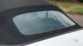 The car is finished in Carrara White and features a black convertible soft top. Additional features include bi-xenon headlights, fog lights, rain-sensing windshield wipers, rear parking sensors, side air intakes, and flared quarter panels. Paintwork is noted on the front spoiler, and the windshield was replaced in September 2019. A stain is present on the soft top. Clear paint-protection film has reportedly been added to the nose, front portion of the hood, and side mirror caps.