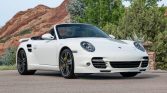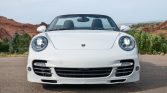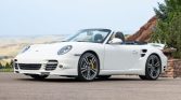 This 2011 Porsche 911 Turbo S is finished in Carrara White over black leather with contrasting stitching, and it is powered by a twin-turbocharged 3.8L flat-six that drives all four wheels via a seven-speed PDK dual-clutch transaxle. Features include a black soft top, the Sport Chrono Package, 19” Turbo II wheels, Porsche Ceramic Composite Brakes, Porsche Torque Vectoring, bi-xenon headlights, rear parking sensors, PCM with navigation, heated front seats, and automatic climate control.