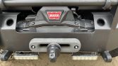 The body is finished in Radiant Red with a color-matched roof and black body cladding. Equipment includes a roof rack, receiver hitch, custom rear-tire carrier, snorkel, off-road lighting, Warn winch, aftermarket bumpers, and rock sliders. The Carfax report notes a May 2017 accident that the seller states resulted in a scuffed front bumper.