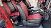 The seats are equipped with aftermarket red and black leather covers, and the cabin features matching red accents on the door panels, dashboard, and steering wheel. The aftermarket stereo system includes an Alpine Digital Media Receiver, dash-mounted iPad, Dynaudio speakers, JL Audio subwoofer, and JL Audio amplifiers. Additional equipment includes a CB radio, a custom passenger tray table, and an overhead monitor connected to an external rock camera.