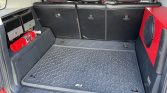 Black-painted 16″ TRD wheels wear 285/75 Goodyear Wrangler Duratrac tires. A matching spare wheel with a Goodyear Wrangler MT/R is fitted on a custom rear carrier. The suspension is modified with aftermarket coilovers, lower control arms, rear trailing arms, rear springs, and bushings.
