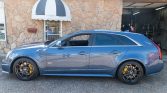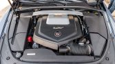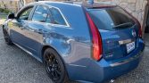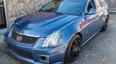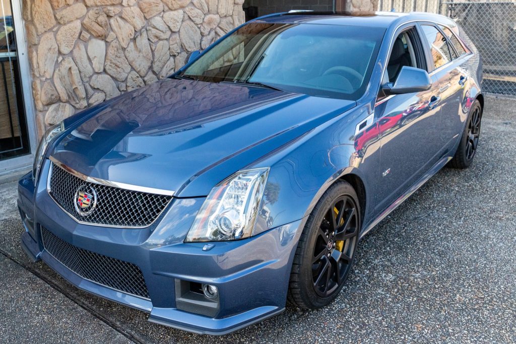 This Cadillac CTS-V wagon is finished in Stealth Blue over Ebony leather and suede and is powered by a supercharged 6.2-liter V8 paired with a six-speed automatic transmission and a limited-slip differential. Equipment includes Magnetic Ride Control, satin-finished 19″ wheels, a power liftgate, a panoramic sunroof, heated and ventilated Recaro front seats, a Bose surround-sound system, navigation, dual-zone automatic climate control, and Midnight Sapele wood trim.