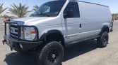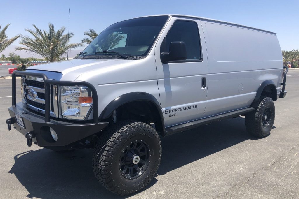 This 2013 Ford E-350 van has been fitted with a Sportsmobile four-wheel-drive conversion and has been registered in California since new. Power is provided by a 6.8-liter V10 paired with a five-speed automatic transmission, a dual-range transfer case, and a rear limited-slip differential. The van is equipped with a Dynatrac ProRock 60 front axle with an ARB air locker, an Atlas II dual-range transfer case, Fox shocks, Aluminess front and rear bumpers, an Aluminess rear tire carrier, a waterproof cargo box, rock sliders, and a CD stereo linked to a JL Audio sound system with a 10″ subwoofer.