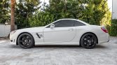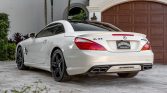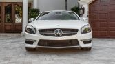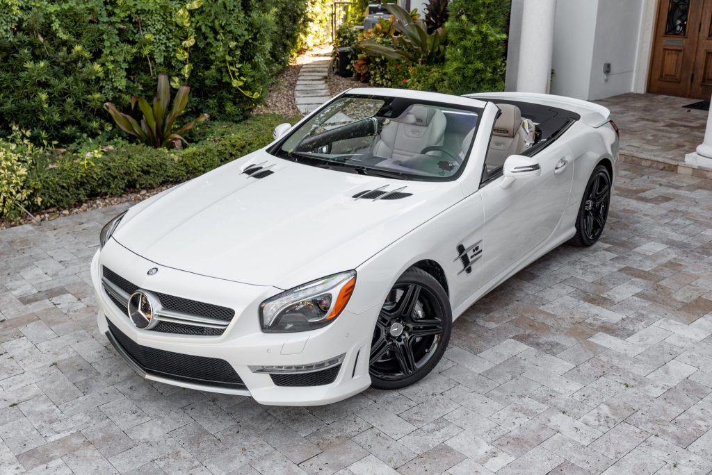 This 2013 Mercedes-Benz SL63 AMG is finished in Diamond White Metallic over beige Premium leather and powered by a twin-turbocharged 5.5-liter V8 paired with a seven-speed automatic transmission and a limited-slip differential. Additional equipment includes 19″ AMG double-spoke wheels, bi-xenon headlights with Active Curve Illumination, active ventilated multicontour seats, an Airscarf system, Keyless-Go, Distronic Plus, a Magic Sky Control panoramic roof panel, carbon-fiber interior trim, and a Harman Kardon sound system.