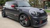 JCW GP edition Minis came finished in Thunder Grey Metallic (B58) with a silver roof, red and black accents, and GP graphics and badging. Additional features include a hood scoop, a rear hatch spoiler, a rear diffuser, bi-xenon headlights, fog lights, brake cooling ducts, and twin exhaust outlets. The seller states that chrome hatch trim was added and ceramic coating was applied to the paint under previous ownership. Additional modifications include window tint and paint protection film on the forward facing surfaces, door edges, and door cups.