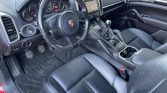 The cabin features seats upholstered in black leather with matching door panels and carpets along with piano black trim on the doors, dashboard, and center console. Equipment includes power-adjustable front seats, headrests embossed with the Porsche crest, cruise control, dual-zone automatic climate control, and a CD stereo linked to a 10-speaker audio system.