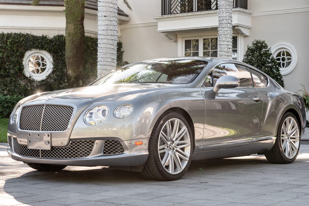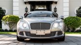 This 2014 Bentley Continental GT Speed is finished in Hallmark over Saddle leather and is powered by a twin-turbocharged 6.0-liter W12 paired with an eight-speed automatic transmission, an all-wheel drive system, and a limited-slip rear differential. Equipment includes xenon headlights with washers, chrome trim, front and rear parking sensors, 21″ alloy wheels, a backup camera, a speed-activated rear spoiler, LED taillights, air suspension, automatic climate control, a touchscreen CD stereo, a navigation system, cruise control, and heated and ventilated power-adjustable front seats.