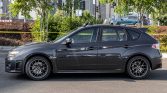 Dark gray 18″ Enkei wheels are mounted with 245/40 Bridgestone Potenza RE-71R tires. Braking is handled by STi-script Brembo calipers fitted over DBA 4000 slotted rotors at all four corners. StopTech brake lines and a steering rack from a 2017 WRX STi have reportedly been installed.