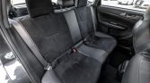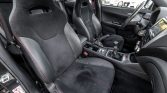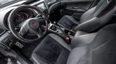 The interior features bolstered sport seats trimmed in black leather and Alcantara with red stitching and embroidered STi logos in the headrests. Features include automatic climate control, aluminum pedals, and a touch-screen stereo display.