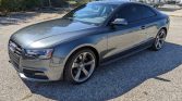 This 2015 Audi S5 Prestige coupe is modified with Unitronic ECU and TCU tunes as well as an AWE exhaust system, an APR heat exchanger, an Integrated Engineering intake, and aftermarket crankshaft and supercharger pulleys. It is finished in Daytona Gray Pearl Effect over black Nappa leather and is powered by a supercharged 3.0-liter V6 that sends power to all four wheels through a replacement seven-speed S tronic dual-clutch automatic transaxle and Quattro all-wheel drive. Equipment includes the Black Optic and Fine Nappa Leather packages as well as a panoramic sunroof, adaptive xenon headlights, 19″ five-arm rotor wheels, heated power-adjustable front seats, dual-zone automatic climate control, and a Bang & Olufsen sound system.