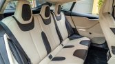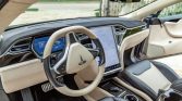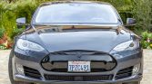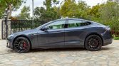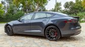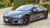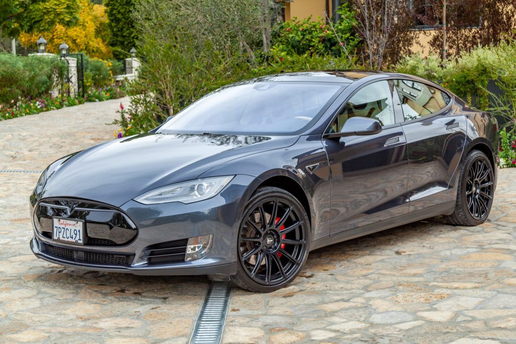 This 2015 Tesla Model S P90D is finished in Midnight Silver Metallic over a custom tan and black leather interior, and power comes from two three-phase AC induction electric motors driving all four wheels through a single-speed direct-drive transmission. Equipment includes the Ludicrous Mode upgrade, 21″ T Sportline wheels, red-finished brake calipers, Smart Air suspension, a carbon fiber spoiler, Autopilot, the Premium Interior Package, Ultra High Fidelity Sound, xenon headlights, parking sensors, Next-Generation seats, and a 17″…