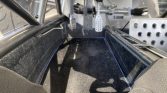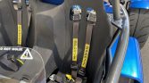 The cabin features fiberglass seats covered in padded black cloth that extends to the center divider. Equipment includes Sabelt racing harnesses, adjustable traction control, drilled aluminum pedals and floorboards, black floor mats, and a passenger-side leather storage compartment.
