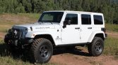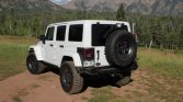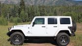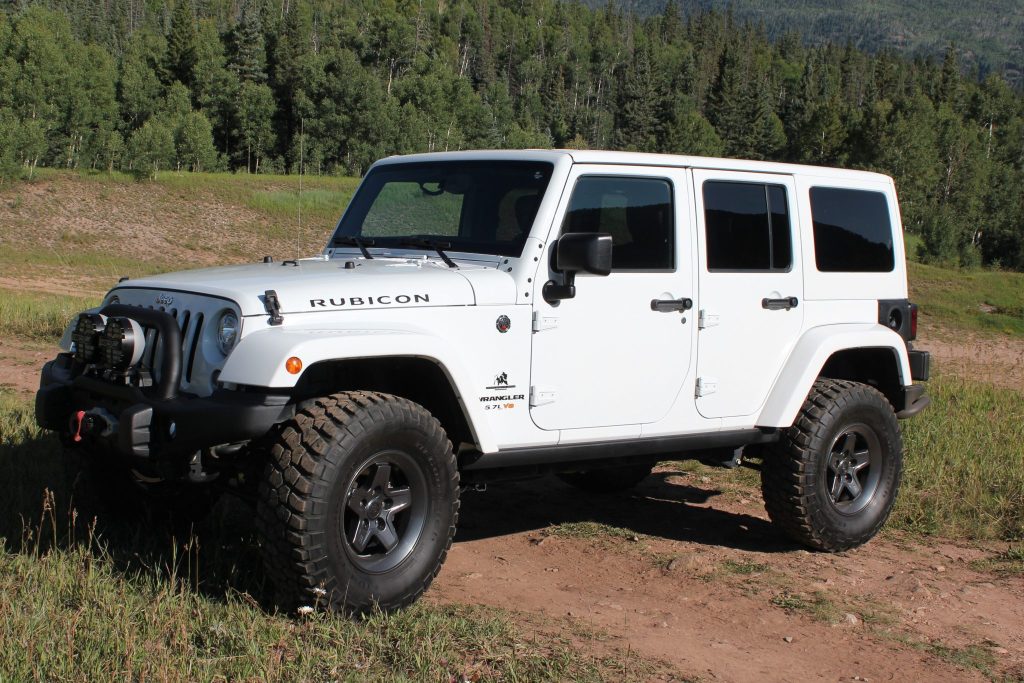 This 2017 Jeep Wrangler Unlimited Rubicon was modified by American Expedition Vehicles of Wixom, Michigan, in October 2016 with the JK250 package and subsequently acquired by the seller in 2017. The truck is finished in Bright White over black leather upholstery and is powered by a 5.7-liter Hemi V8 paired with a five-speed automatic transmission, a Rock-Trac dual-range transfer case, and locking Dana 44 axles. Additional modifications include a 2.5″ suspension lift, a Warn winch, IPF lighting, stamped-steel bumpers and skid plates, and 17″ AEV wheels with 35″ BFGoodrich Mud-Terrain tires.