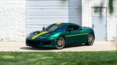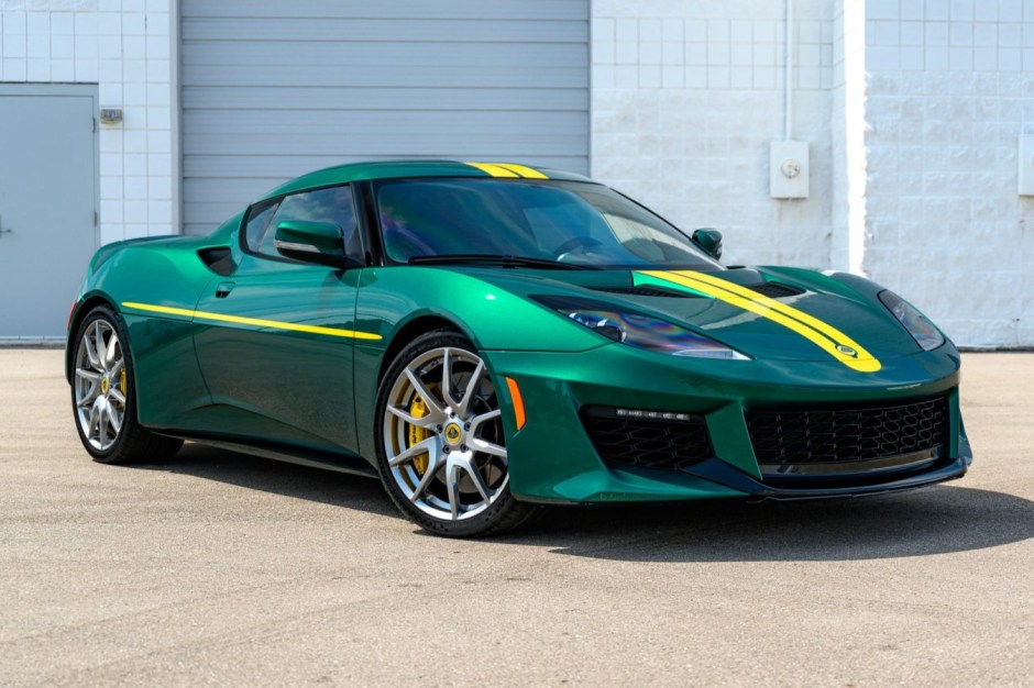 This 2017 Lotus Evora 400 is finished in Racing Green with yellow stripes and is powered by a supercharged 3.5-liter V6 mated to a six-speed manual transaxle with a Torsen limited-slip differential. Inside, the heated Sparco seats are trimmed in black leather and Alcantara and accompanied by an aftermarket audio system. Further equipment includes bi-xenon headlights, LED taillights, and an active exhaust system along with Bilstein dampers, Eibach springs, AP Racing disc brakes, and staggered-diameter alloy wheels.