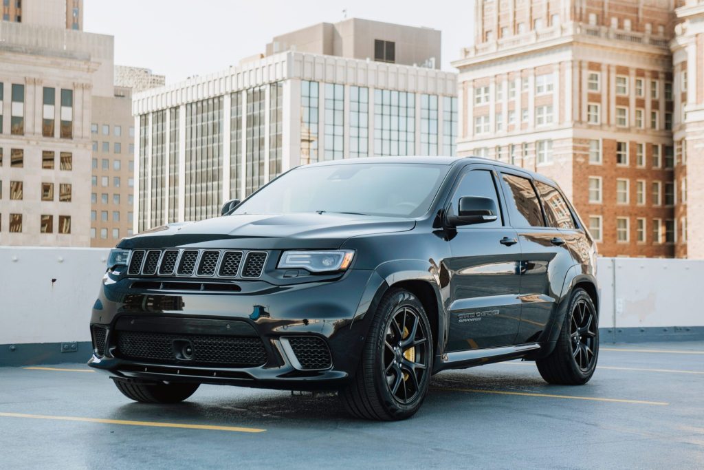 The black satin-finished 20″ aluminum wheels are mounted with Pirelli Scorpion Verde All Season tires measuring 295/45 all around. The Trackhawk rides on a Bilstein competition suspension with adaptive damping and is equipped with a Selec-Trac system with launch control and five drive modes. An Eibach anti-roll kit and lowering springs are installed. Stopping power is provided by yellow-finished six-piston front and four-piston rear Brembo brake calipers.