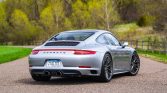 This 2018 Porsche 911 Carrera 4S coupe was fitted with an Akrapovic exhaust system, GTS-sourced turbochargers, BMC air filters, an IPD plenum, a GIAC ECU tune, a Numeric short shifter, an Escort radar detector, 20″ RS Spyder Design alloy wheels, TechArt lowering springs, H&R wheel spacers, and ventilated rear hub carriers. It is finished in GT Silver Metallic over Luxor Beige leather upholstery, it is powered by a twin-turbocharged 3.0L flat-six that drives all four wheels through a seven-speed manual transaxle. The car is further equipped with the Sport Chrono Package, a sunroof, 18-way heated and ventilated adaptive Sport Plus front seats, PCM with navigation, and a Bose sound system.