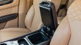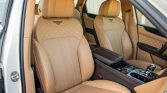 The seating surfaces are trimmed in Camel leather with contrasting stitching. The Front Seat Comfort Specification consists of 22-way power-adjustable front seats with heat, ventilation, and massaging functions as well as position memory, front comfort headrests, and electric height adjustment for the front seatbelts. Mulliner Driving Specification added diamond-quilted seat and door panel inserts, drilled alloy pedals, and embroidered Bentley emblems on the seat backs. The cabin also features multi-zone automatic climate control, a 10-speaker sound system, a quilted rear bumper guard in the rear cargo area, all-weather floor mats, a veneer-finished center fascia panel, and an infotainment system with an 8″ touchscreen, navigation, and Bluetooth connectivity.