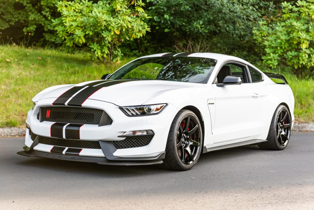This 2019 Ford Mustang Shelby GT350R is optioned from the factory with the Electronics Package as well as black and red vinyl over-the-top stripes that accent the Oxford White-finished body. Having 3,500 miles, the car is powered by a 5.2-liter Voodoo V8 linked with a six-speed manual transmission and is further equipped with Ebony and red upholstery, a Torsen limited-slip differential, 19″ carbon-fiber seven-spoke wheels, Brembo brake calipers, a carbon-fiber wing, a touchscreen infotainment system with voice-activated navigation, a Bang & Olufsen sound system, blind-spot monitoring, a rearview camera, and Recaro seats.