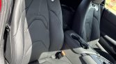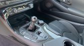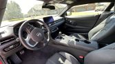 The heated power-adjustable sport seats are upholstered in black leather with white stitching that extends to the upper dashboard, center console, and door panel inserts. Carbon-fiber trim accents the cabin, and additional appointments include driver-seat position memory, dual-zone automatic climate control, a GR-logo shift knob, and a 12-speaker JBL sound system connected to an 8.8″ touchscreen infotainment system with navigation, Apple Carplay, and Bluetooth connectivity.