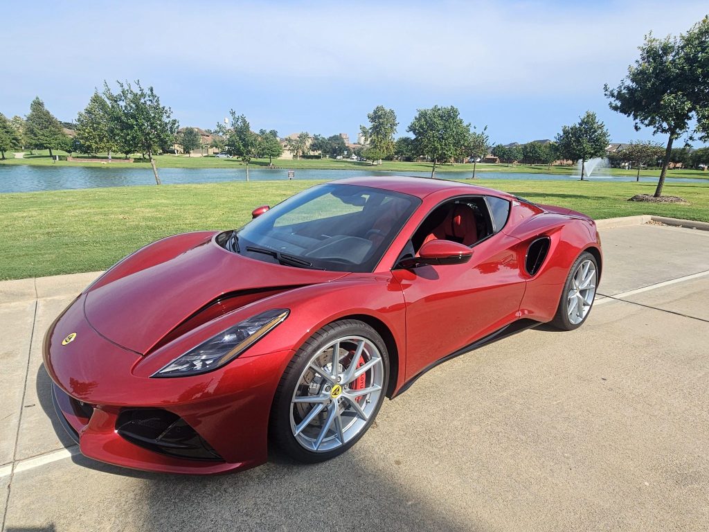 This 2024 Lotus Emira is a First Edition example finished in Magma Red over red Nappa leather and is powered by a supercharged 3.5-liter V6 mated to a six-speed manual transaxle. The First Edition specification adds 20″ forged wheels, a limited-slip differential, a switchable exhaust system, KEF premium audio, a rearview camera, and heated seats, while this example features selected options including the Lower Black Pack, a Touring suspension, and red brake calipers. Bilstein dampers, LED lighting, and…