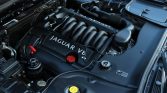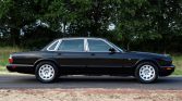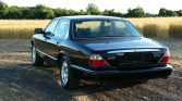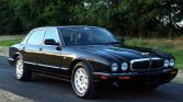The car is finished in Anthracite Black and features chrome trim on the grille, windows and trunk lid, body-colored bumpers, a jaguar hood ornament, fog lights, a power sunroof, and dual-exit tailpipes.