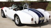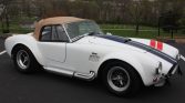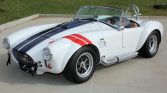 This Hurricane Motorsports Roadster is a Shelby Cobra replica that was acquired by the seller as a rolling chassis and assembled in June 2010. The car is finished in white with blue and red stripes over tan and is powered by a 432ci Ford FE V8 paired with a five-speed TKO600 manual transmission and a Ford Traction-Lok limited-slip differential. Additional equipment includes an independent front and rear suspension, 15″ Trigo knock-off wheels, QA1 adjustable coilovers, Mustang II-style rack-and-pinion…